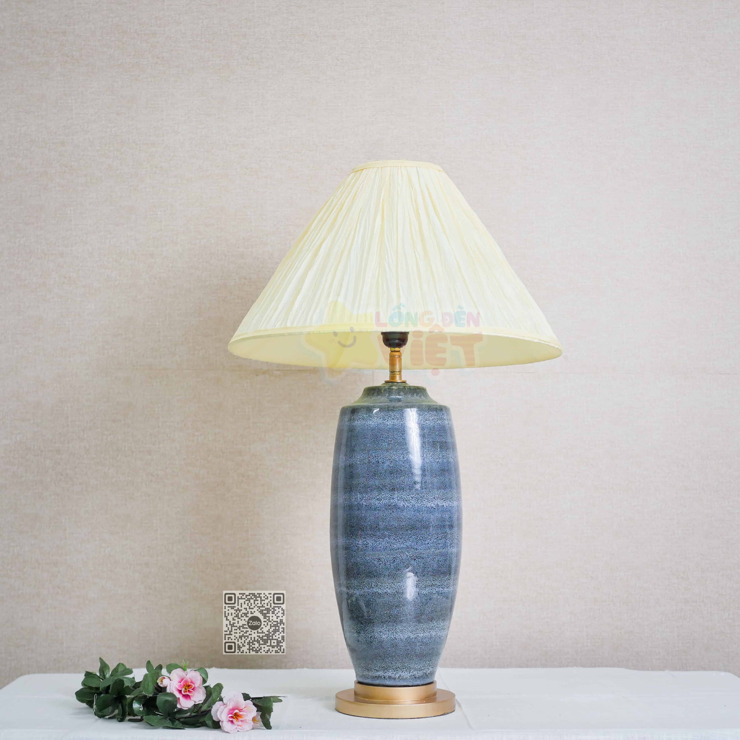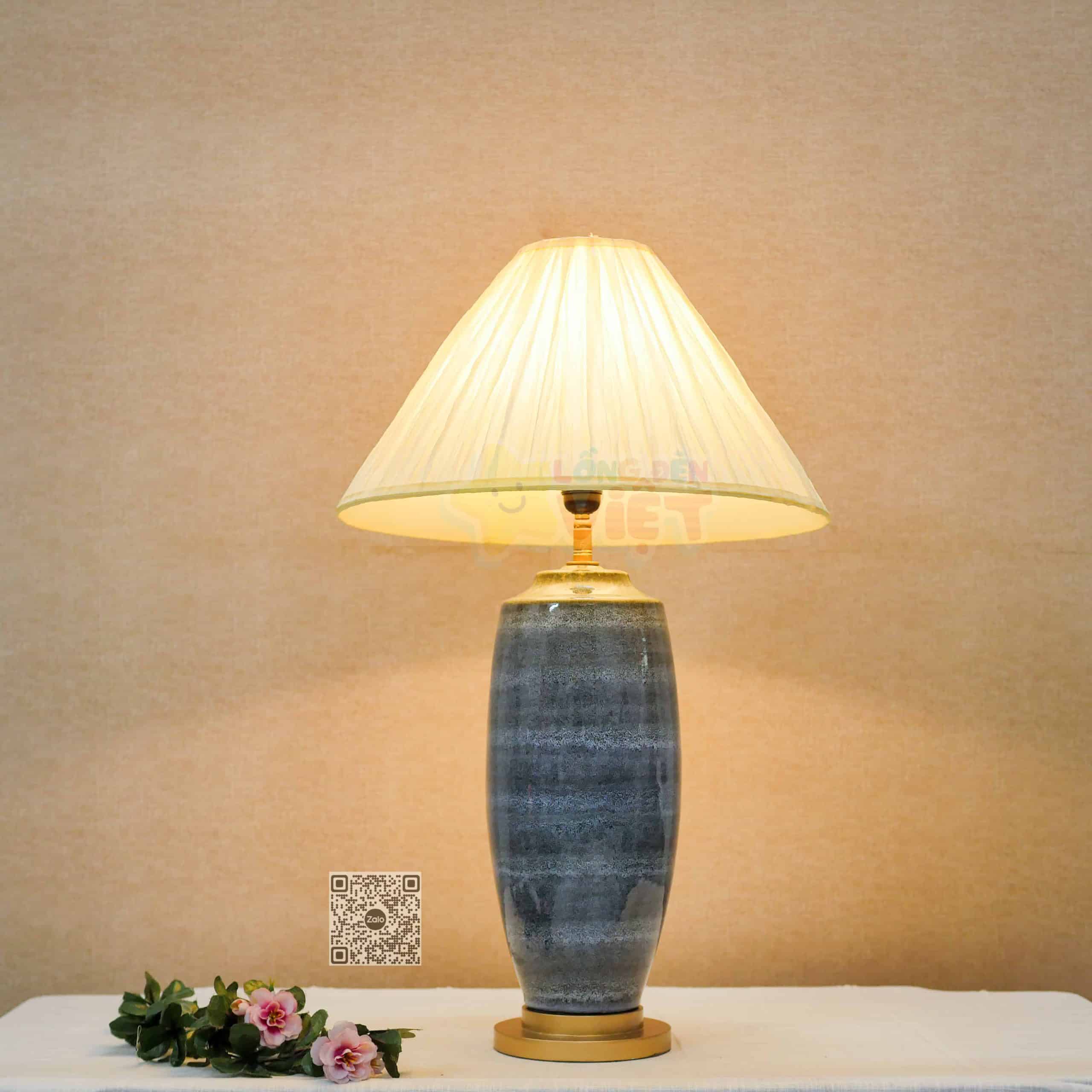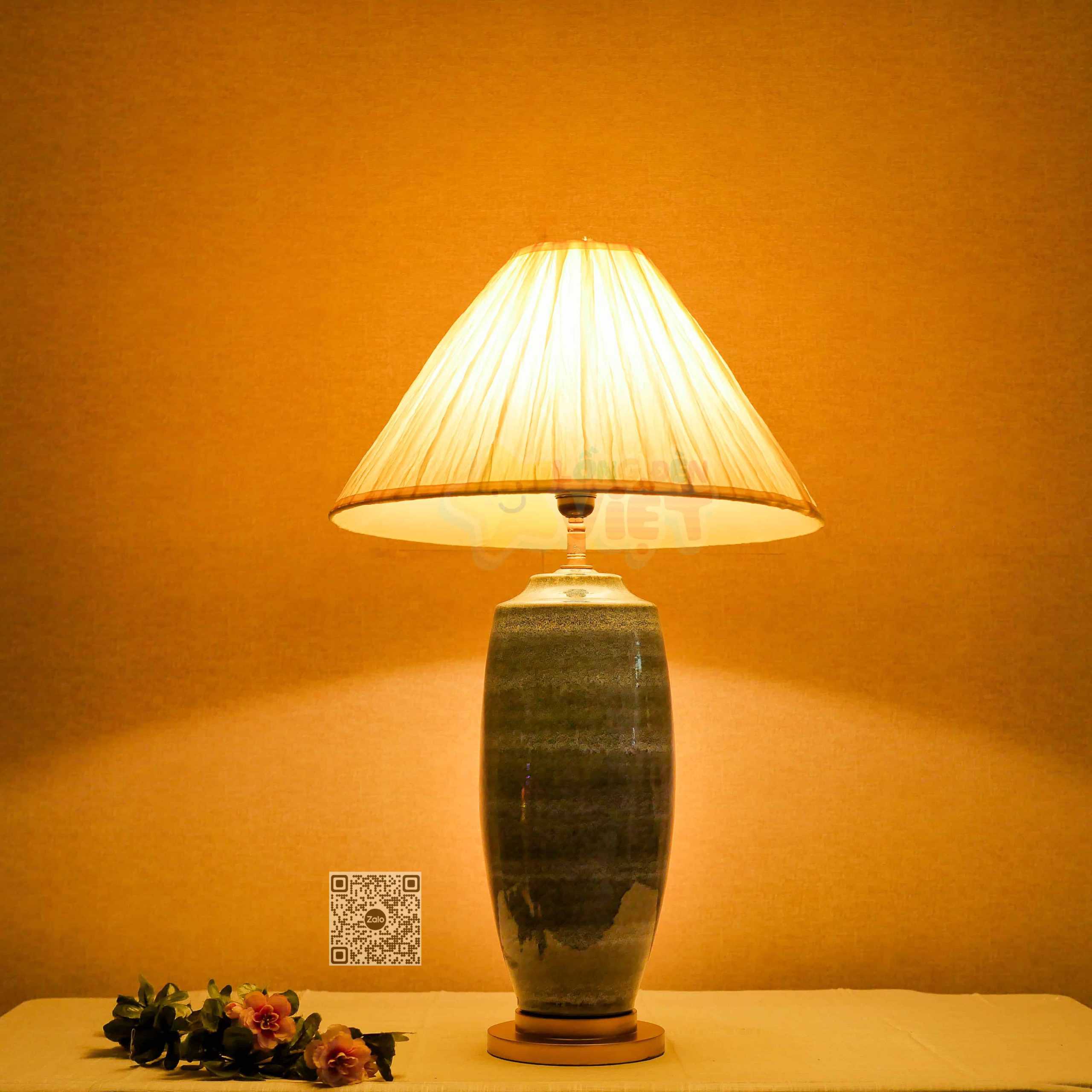 – Chất liệu: bình sứ, ti sắt, đế gỗ và chao đèn vải nhăn nghệ thuật