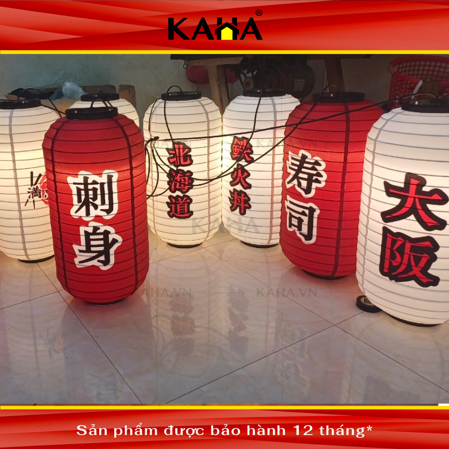 Đặc điểm: chất liệu khung sắt sơn tĩnh điện, bọc vải hoạ tiết chữ Nhật, đèn lồng thích hợp treo ở nhà hàng, quán ăn phong cách Nhật. Độ bền trong nhà cam kết trên 12 tháng.