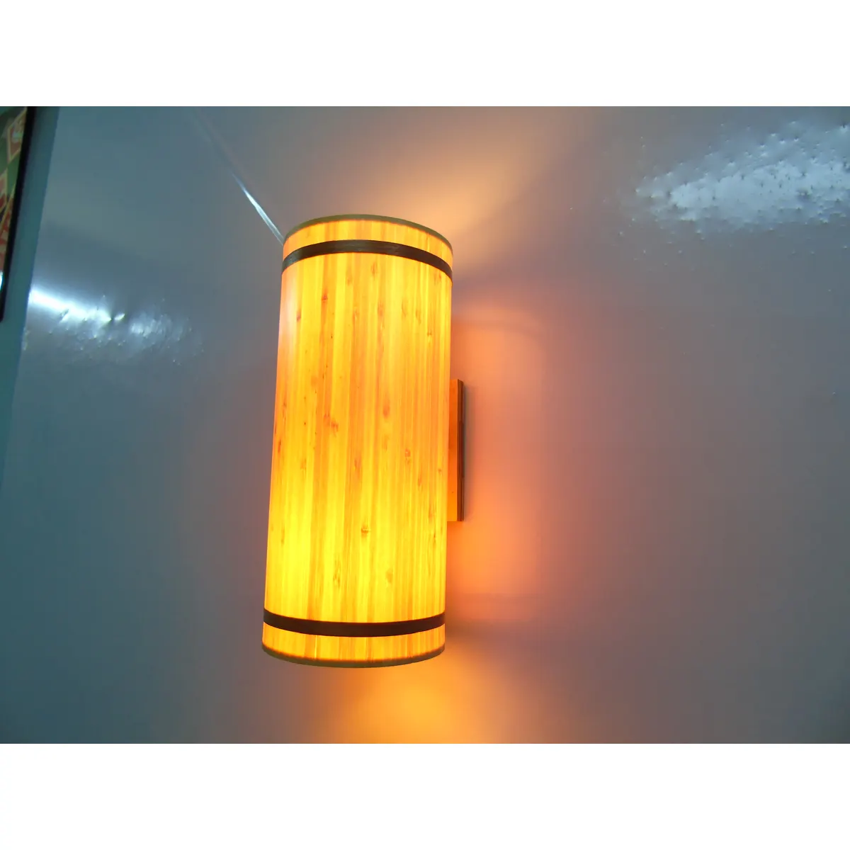Đèn áp tường gỗ và tre hình trụ, chất liệu tự nhiên mộc mạc ấm áp, phù hợp nhà hàng phong cách Á Đông và không gian spa.