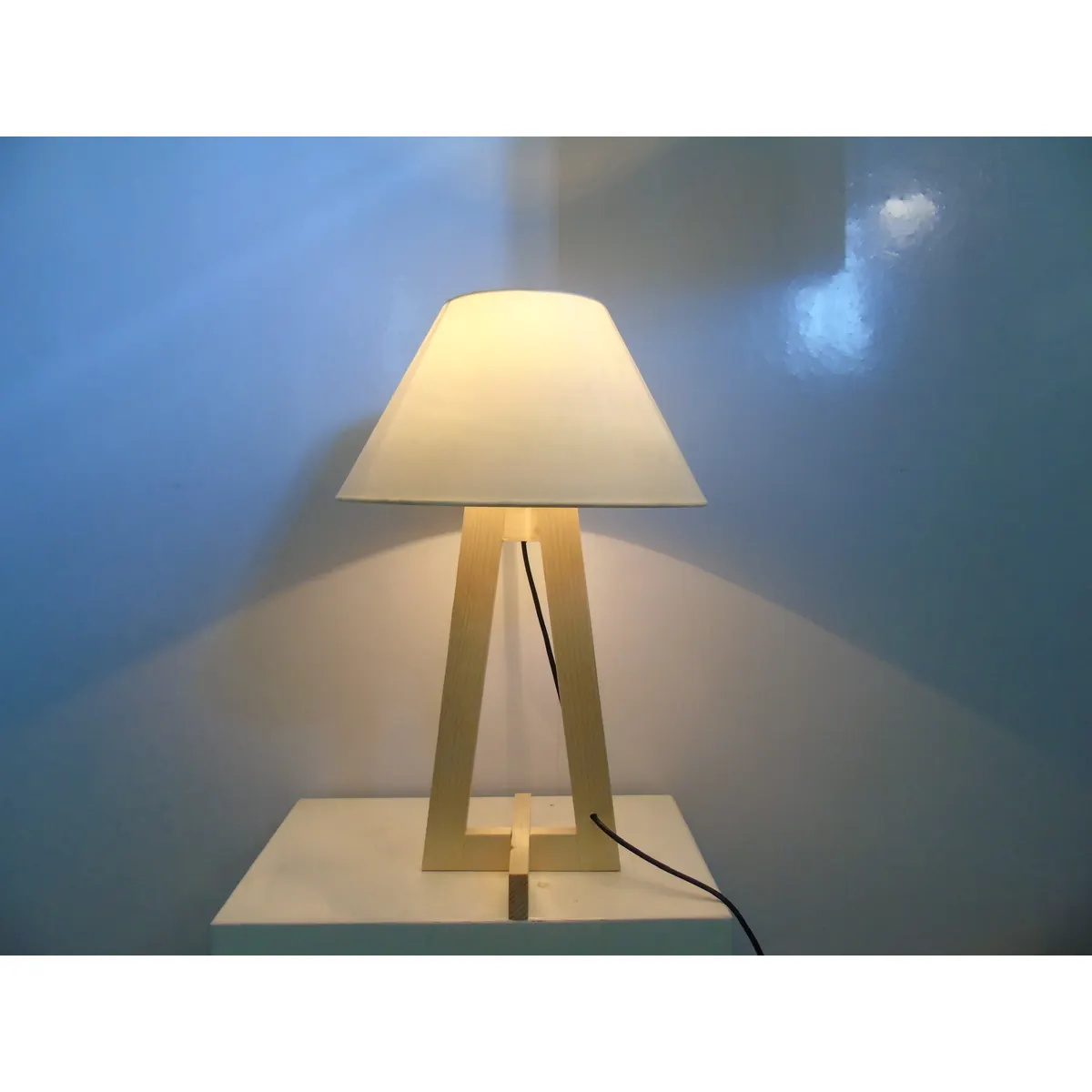 “Đèn bàn gỗ 4 chân gọn nhẹ kết hợp chụp vải nón trắng tinh, ánh sáng dịu toả đều phù hợp tủ đầu giường và bàn làm việc.”