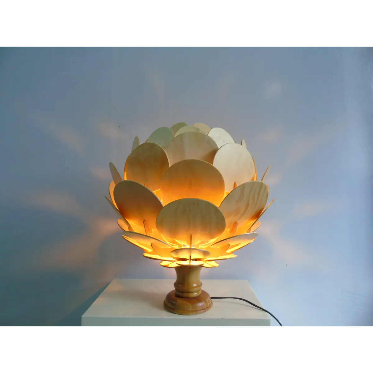Đèn bàn gỗ thiết kế cánh hoa artichoke nở rộ, ánh sáng xuyên qua từng cánh tạo bóng nghệ thuật đẹp mắt trên mặt bàn và tường.