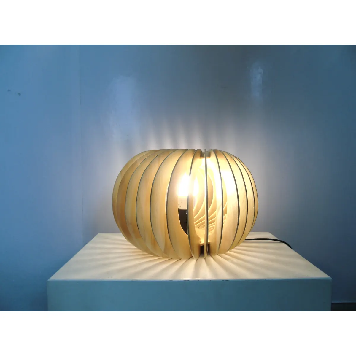 “Đèn bàn gỗ tạo hình bí ngô dẹt với kết cấu xoắn ốc, điêu khắc gỗ tinh xảo tạo tác phẩm nghệ thuật chức năng cho không gian sống.”