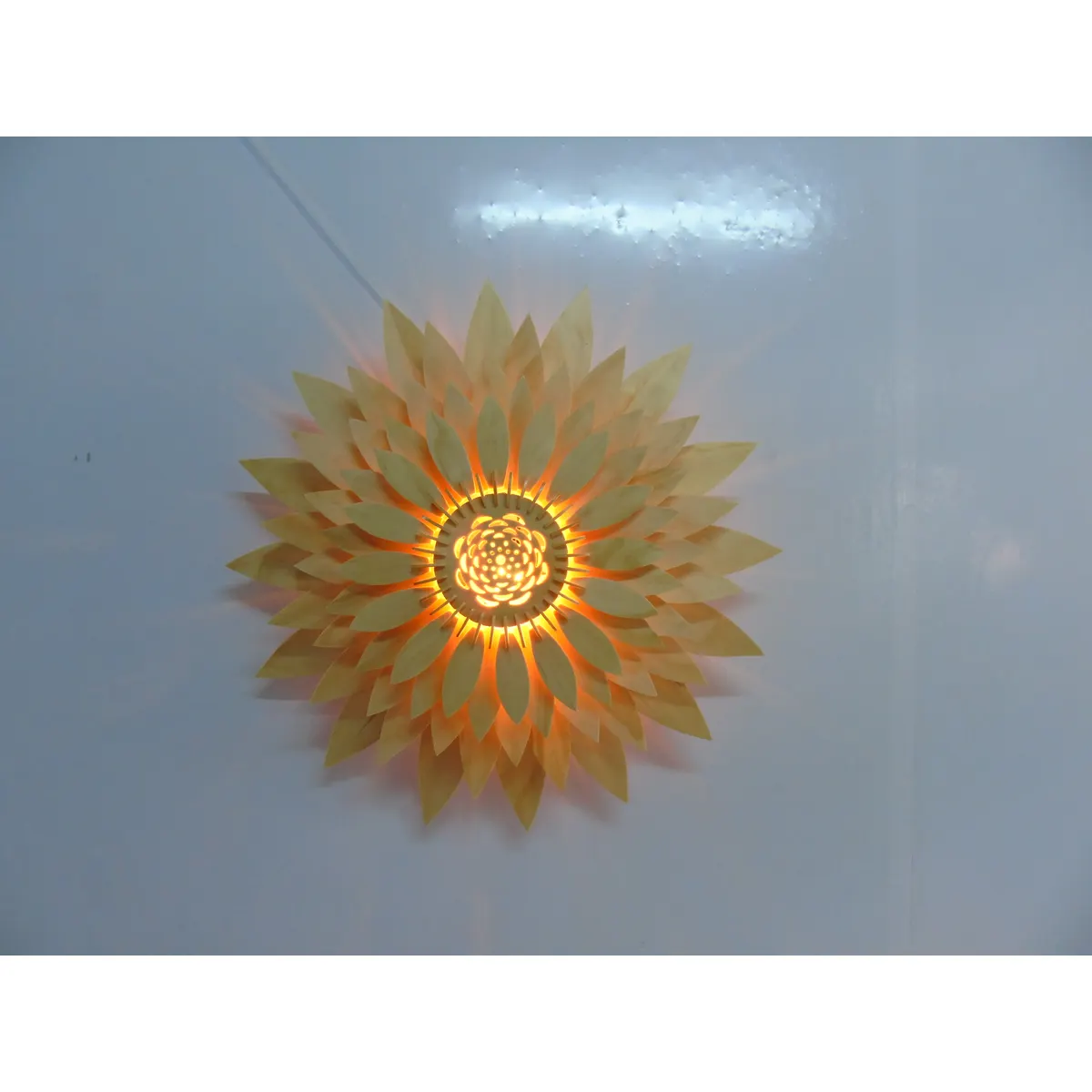 “Đèn ốp trần gỗ tạo hình hoa hướng dương rực rỡ, cánh hoa gỗ xếp đều toả ra từ tâm, ánh sáng ấm phủ đều căn phòng.”