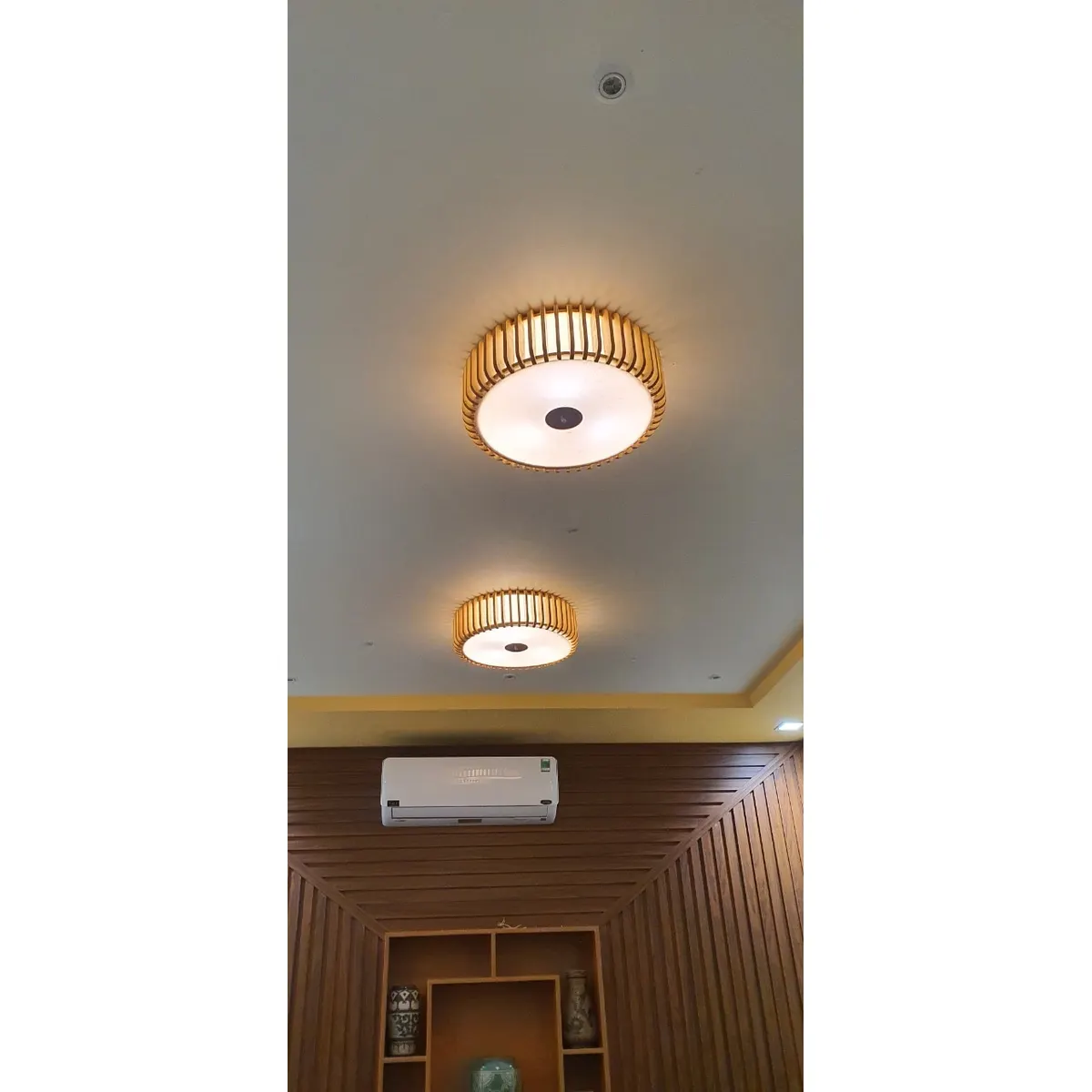 “Đèn ốp trần gỗ hình tròn thiết kế tối giản, toả sáng dịu nhẹ xuống không gian phòng khách, phòng ngủ và hành lang.”