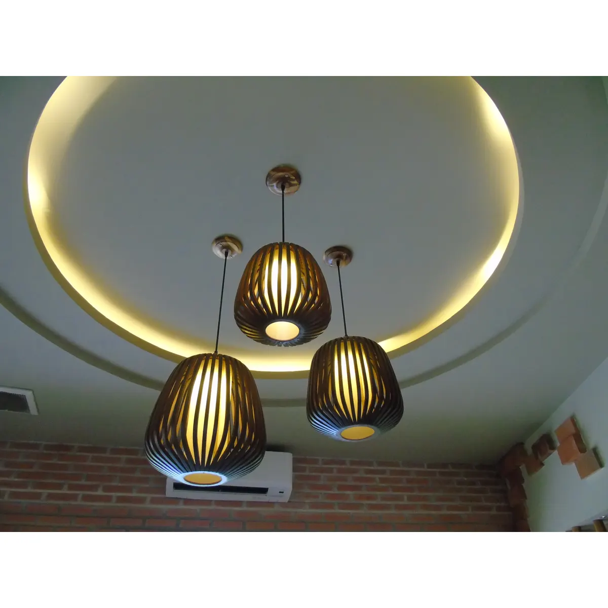 “Bộ đèn thả gỗ tối màu gồm 3 chiếc hình trứng treo cụm ở độ cao khác nhau, tạo điểm nhấn thị giác mạnh mẽ cho nhà hàng sang trọng.”