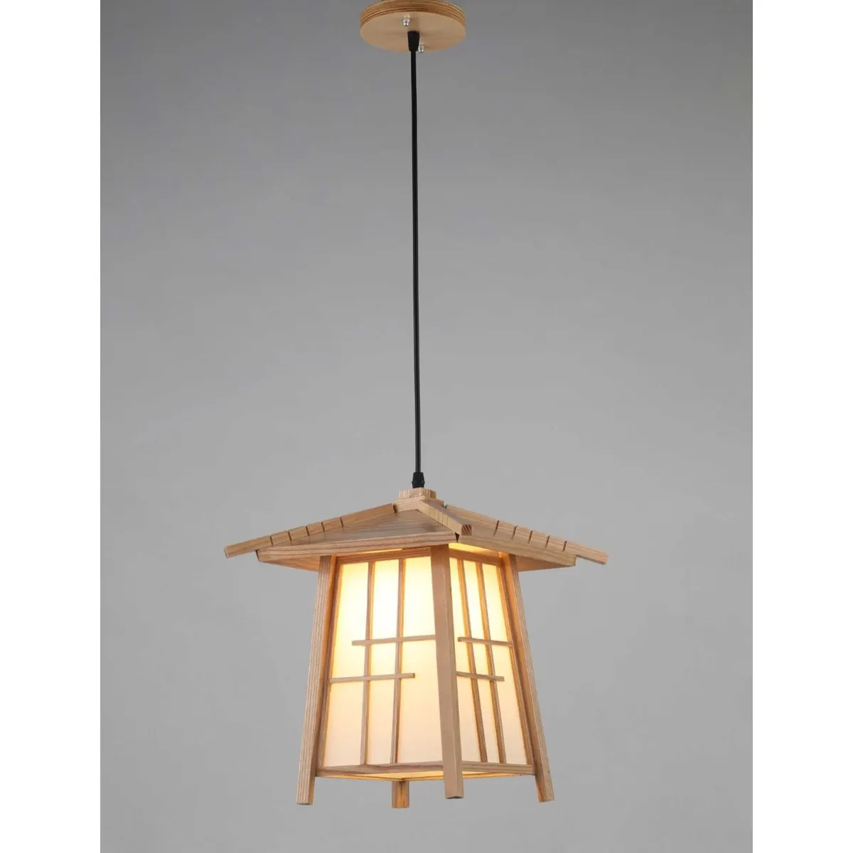 “Đèn thả gỗ tạo hình kiến trúc nhà Nhật Bản truyền thống, đường nét tinh xảo, ánh sáng ấm áp phù hợp phòng khách và nhà hàng phong cách Á Đông.”