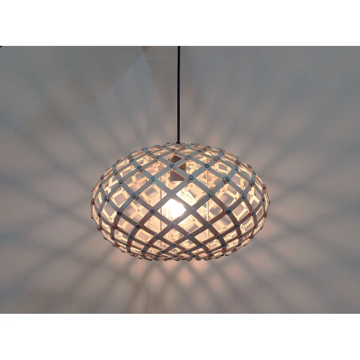 “Đèn thả gỗ hình bầu dục với lưới đan màu trắng tinh tế, ánh sáng lọc nhẹ nhàng qua ô lưới tạo không gian ăn uống thư thái.”