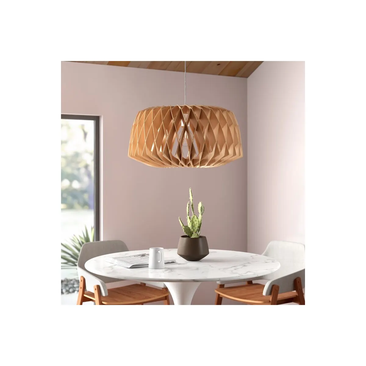 “Đèn thả gỗ lưới kim cương phong cách tối giản sang trọng, ánh sáng lọc qua khe hở tạo hiệu ứng hoa văn trên tường.”