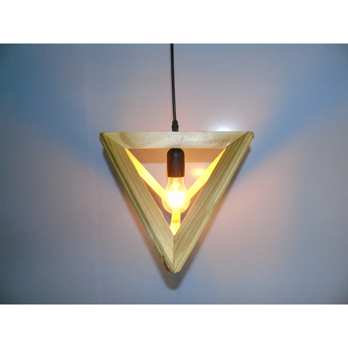Đèn thả gỗ hình tam giác hình học tối giản, phong cách thiết kế công nghiệp hiện đại, phù hợp văn phòng, quán cà phê và nhà hàng.
