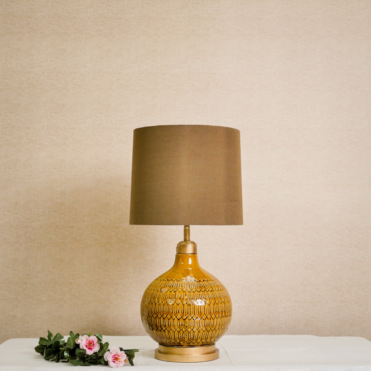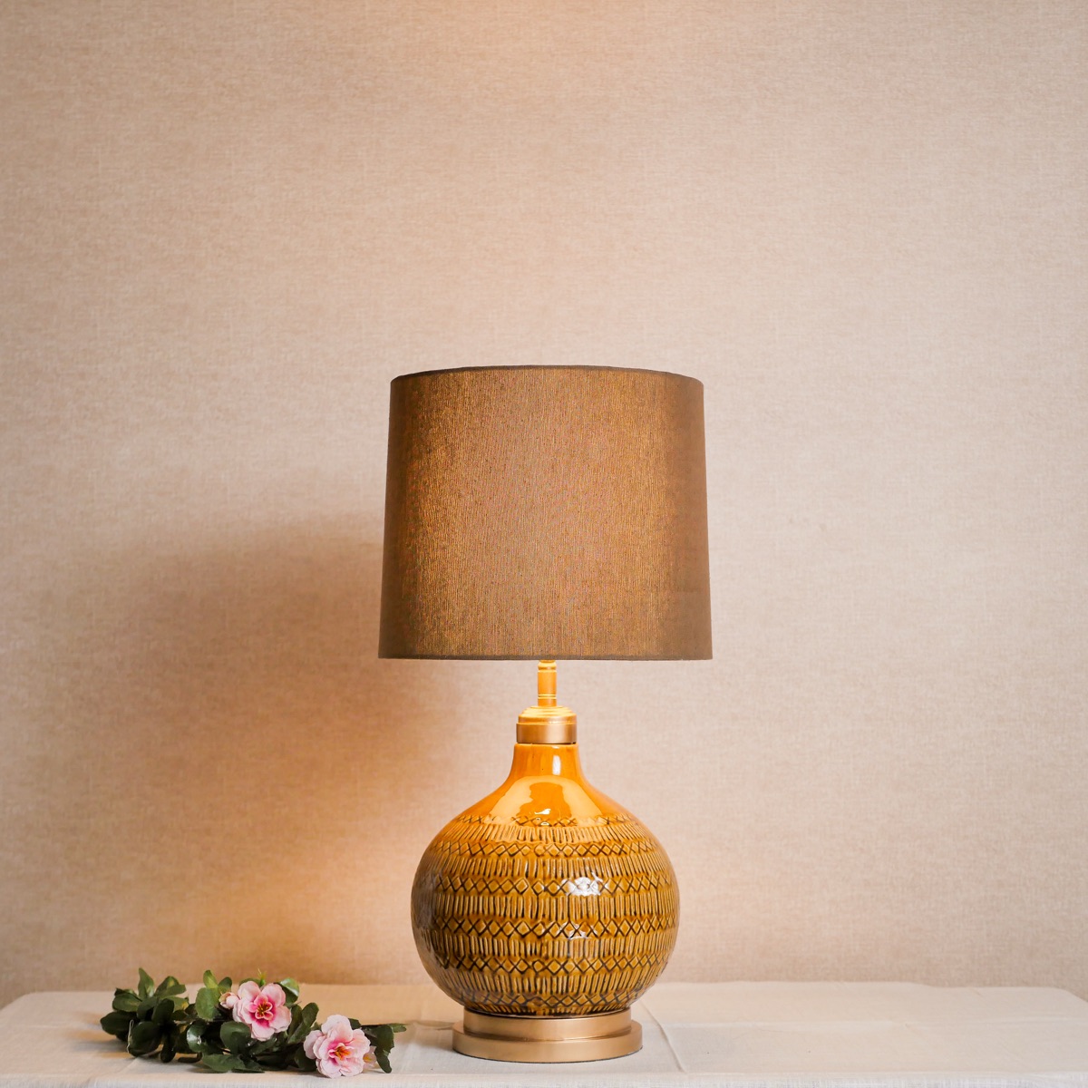 “Đèn bàn gốm màu caramel ấm áp kết hợp chụp vải nâu lanh. Đèn ngủ đầu giường lý tưởng tạo không gian thư giãn.”
