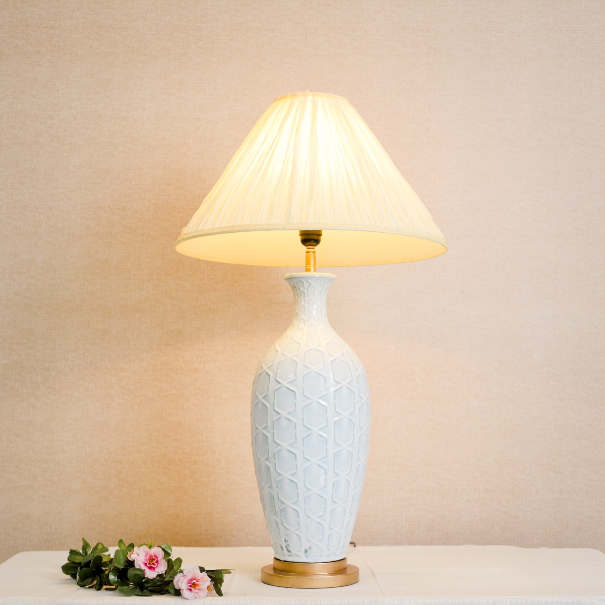 Đèn bàn gốm trắng với hoa văn lục giác (hexagon) dập nổi tinh xảo kết hợp chụp đèn vải hình nón (cone shade) màu kem mềm mại. Thiết kế hài hòa giữa hoa văn hình học hiện đại và chất liệu thủ công truyền thống. Thích hợp làm đèn đọc sách, đèn bàn phòng ngủ hay đèn trang trí phòng khách. Ánh sáng ấm áp, khuếch tán đều qua vải chất lượng cao. Đèn bàn gốm sứ Việt Nam, nhận đặt theo số lượng. Liên hệ báo giá.