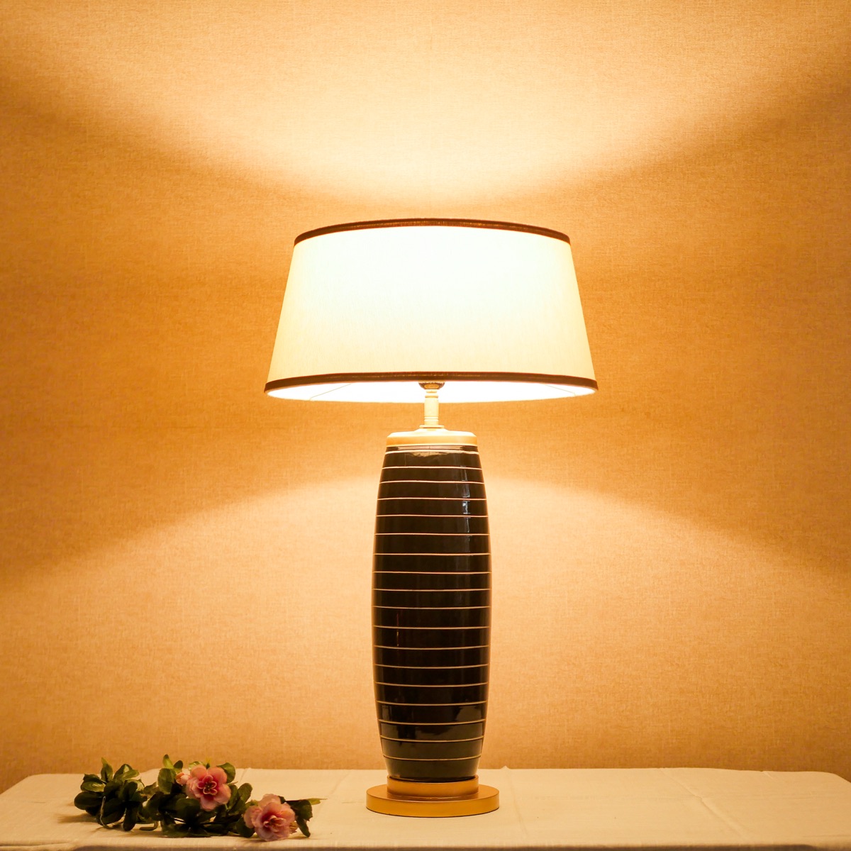 “Đèn bàn gốm trắng sọc ngang thanh lịch, chụp vải hình thang màu kem viền nâu. Lý tưởng làm đèn ngủ đầu giường hoặc đèn đọc sách.”