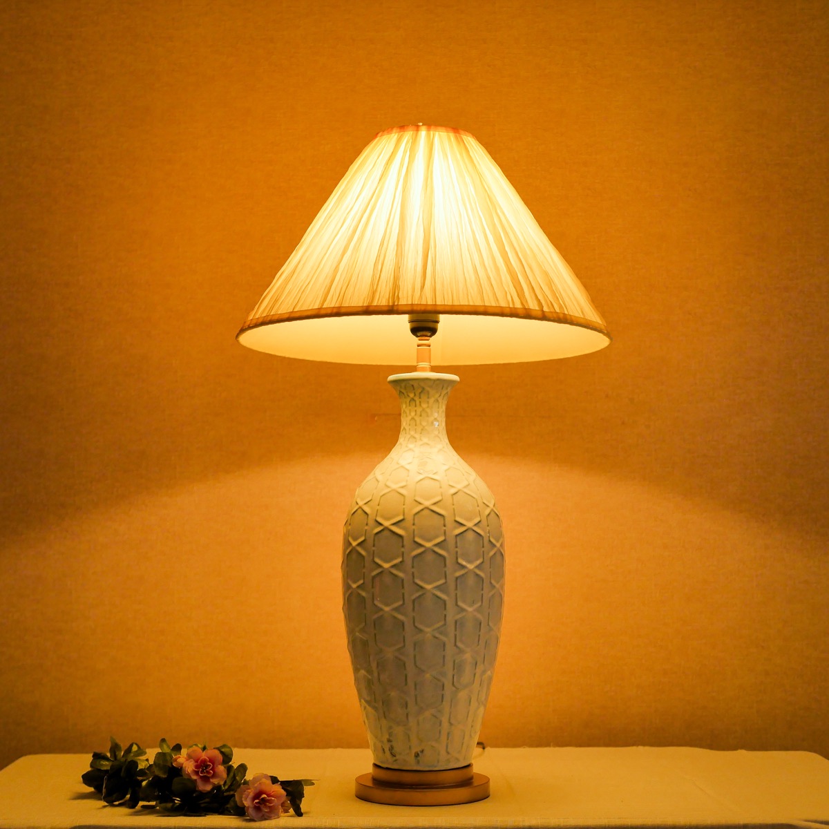 “Đèn bàn gốm trắng vân mạng nhện (crackle glaze) độc đáo, chụp vải nón kem thanh thoát. Đèn bàn vintage đặc biệt.”