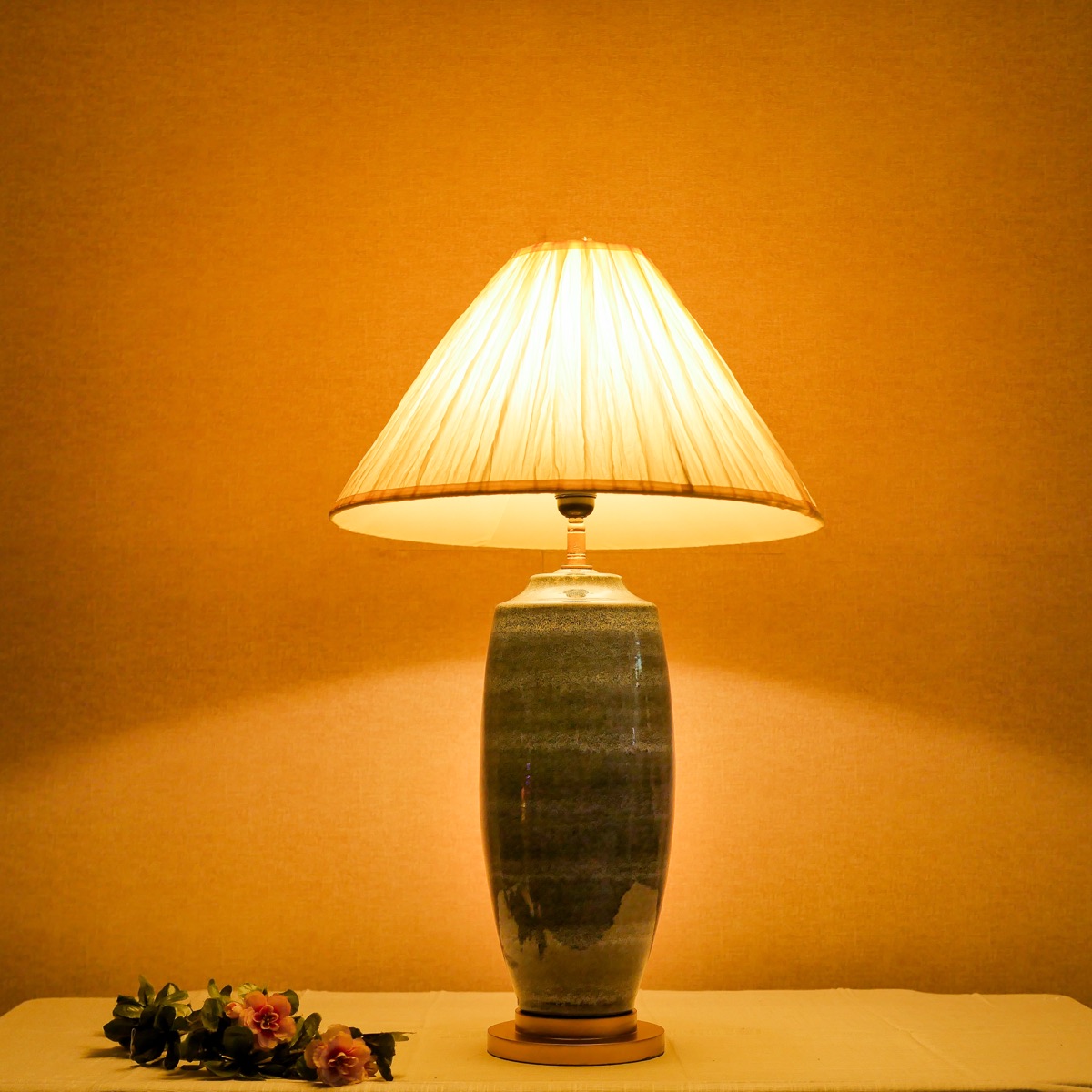 “Đèn bàn gốm xanh đậm men loang nghệ thuật, kết hợp chụp vải nón kem. Đèn bàn độc đáo, phong cách nghệ thuật.”