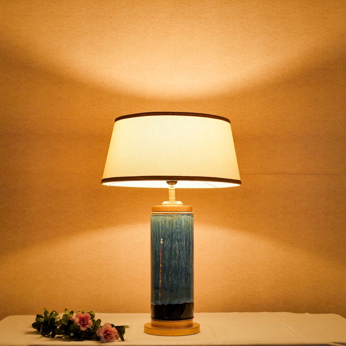 Đèn bàn gốm xanh dương với hiệu ứng vân nứt (crackle/streaked glaze) và đai đen trang nhã ở đáy. Chụp đèn vải hình thang màu kem mềm mại, ánh sáng ấm. Thiết kế vintage độc đáo, mỗi chiếc một vân nứt khác nhau — không có hai sản phẩm giống hệt nhau. Thích hợp làm đèn ngủ đầu giường phong cách retro-vintage, đèn trang trí quán cafe, homestay. Chụp đèn vải bền, dễ thay thế. Liên hệ để đặt hàng theo số lượng.