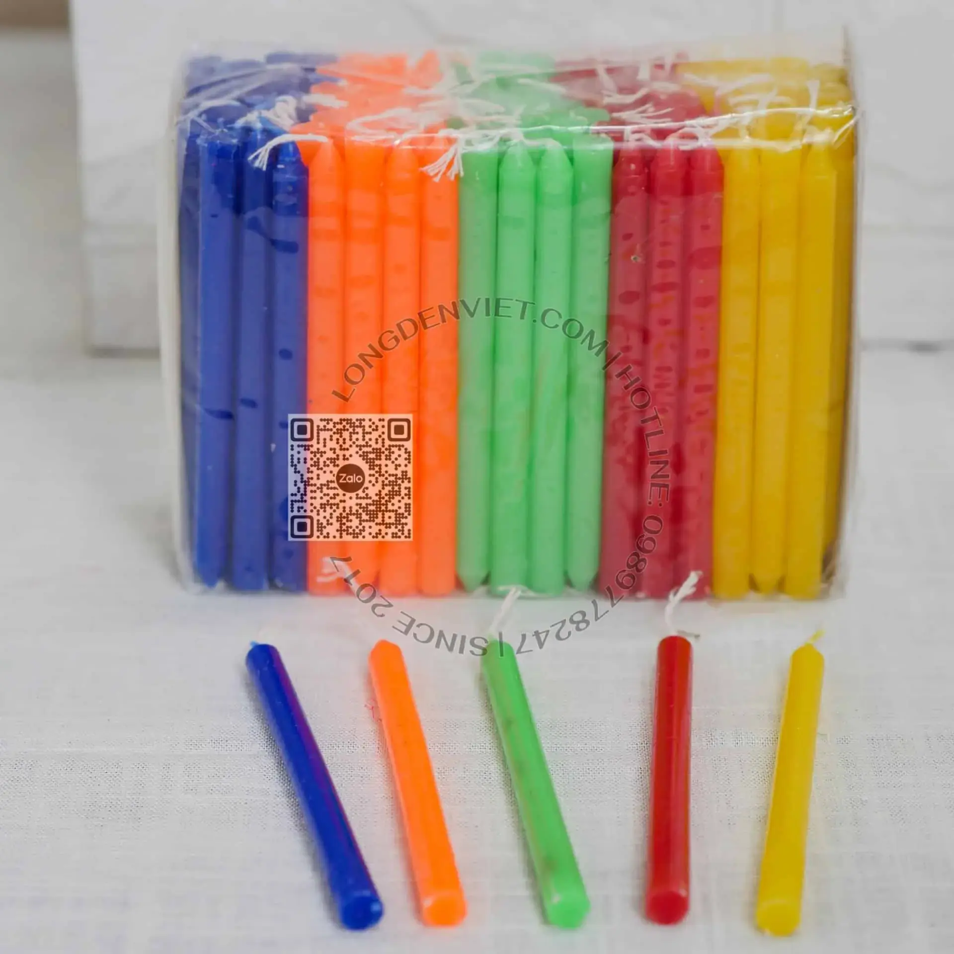 – Chất liệu: sáp màu – Màu sắc: 5 màu như hình – Kích thước: 10cm – Số lượng: 30 cây/ 1 bịch – Bảo quản: dùng trong mùa Trung thu, có khả năng bị cháy