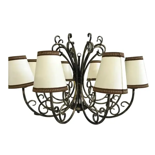 - Tên sản phẩm: Đèn chùm trang trí 8 chụp KH-DTR015 - Mã sản phẩm: KH-DTR015 - Chất liệu: khung sắt nghệ thuật, chao đèn vải đũi viền vải ac dù - Màu